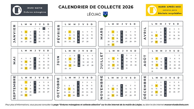 Collecte sélective (bac jaune) : pour vos emballages recyclables (carton, plastique, etc.), la collecte aura lieu le mardi après-midi en semaine paire à partir du 6 janvier 2026.